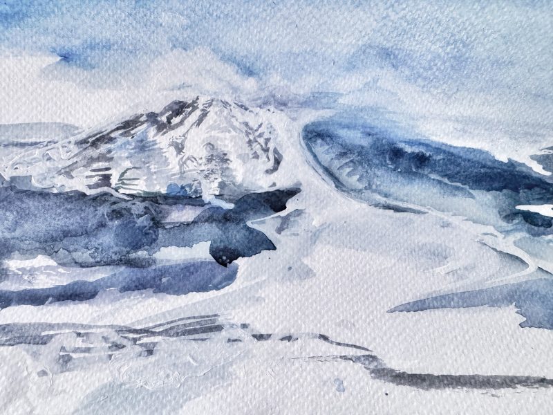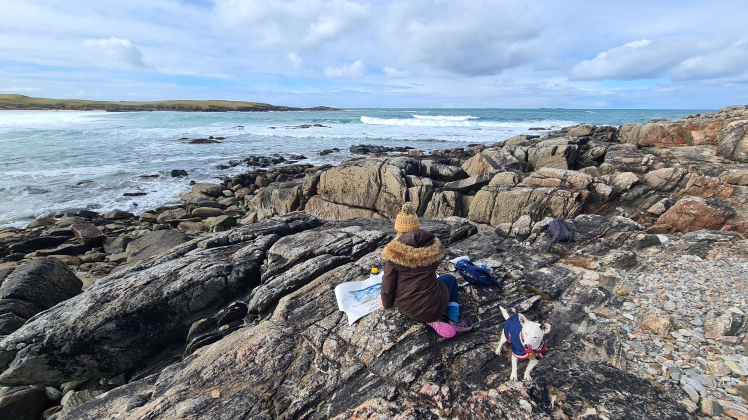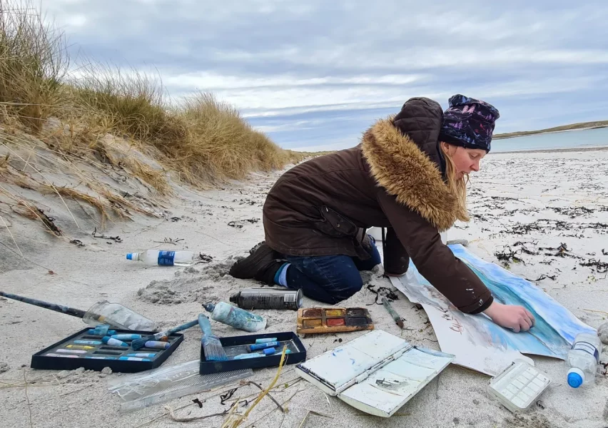 Each piece begins as small locational sketches which often aim to capture the ever changing light as well as raw aspects of the sea. Studies are later used as starting points to develop oil paintings, where the varied application of layered textures creates a feeling of depth, whilst reflecting the sea’s movements. Collage and mono printing combine to build up the natural variation of surfaces found on rocks which surround the Hebridean coast.