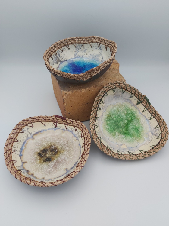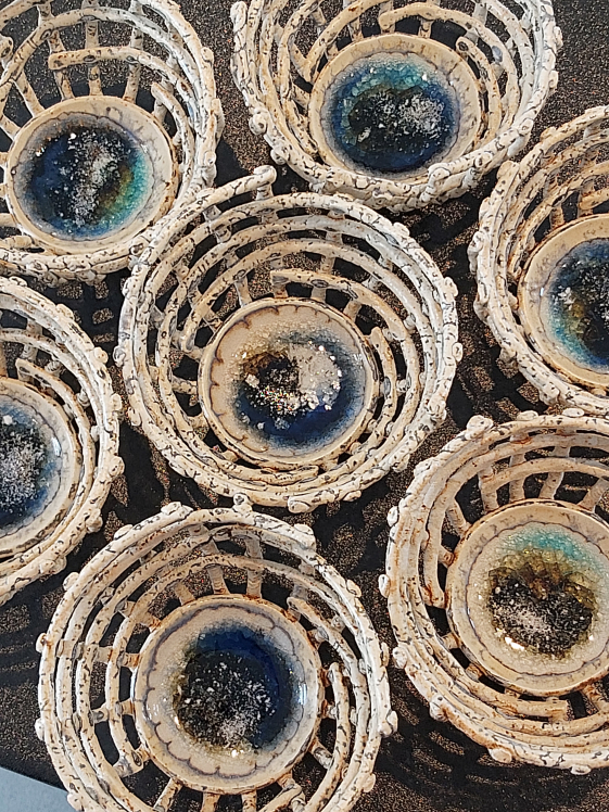 These beautiful individual pieces, capture the rugged beauty of the Hebrides. The changing light and seasons are captured in the use of glaze, natural rock sediments and recycled glass.