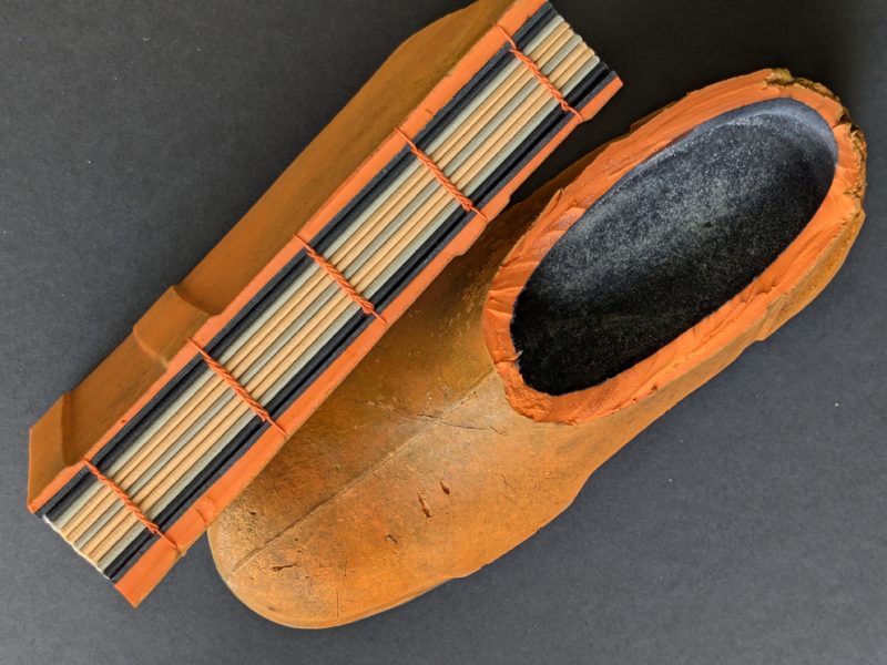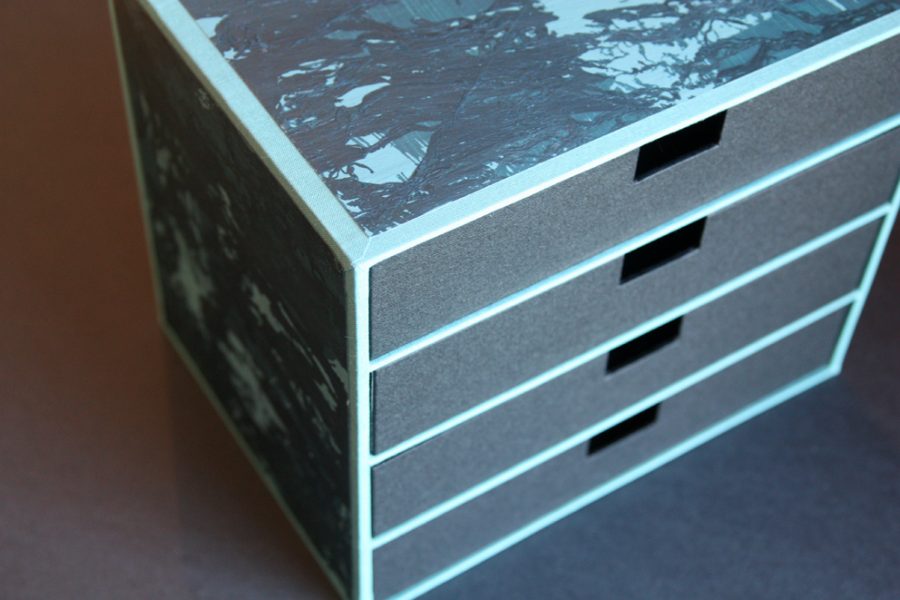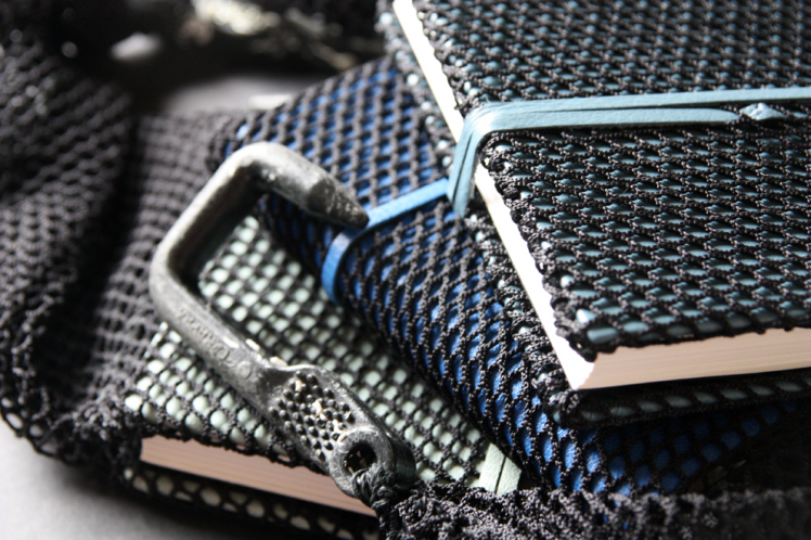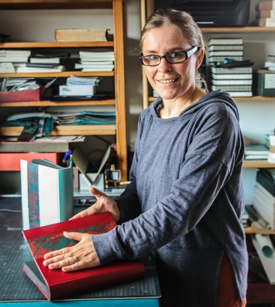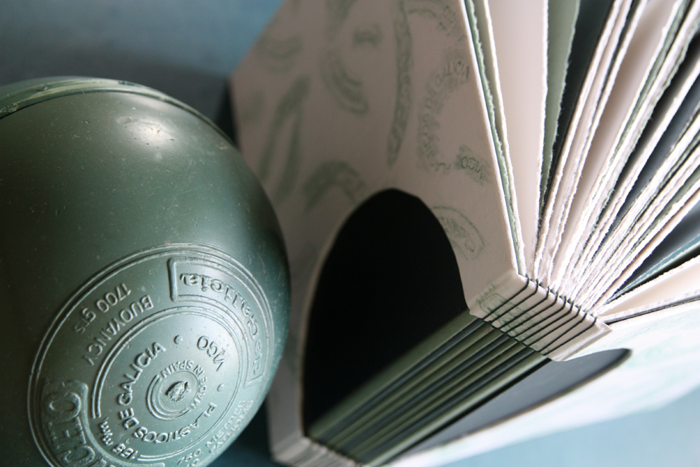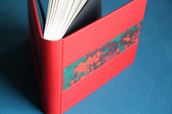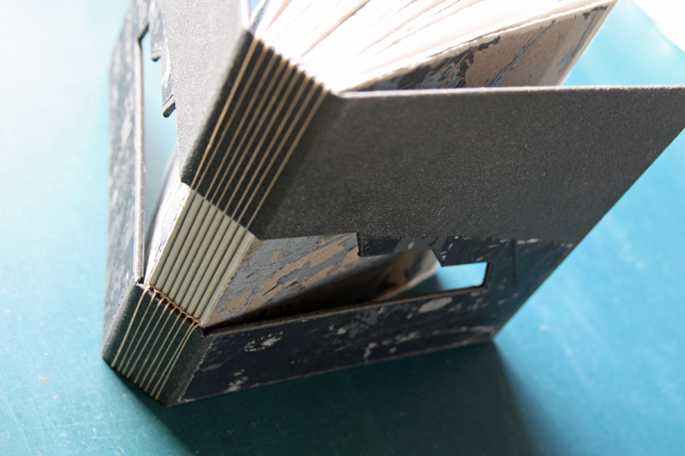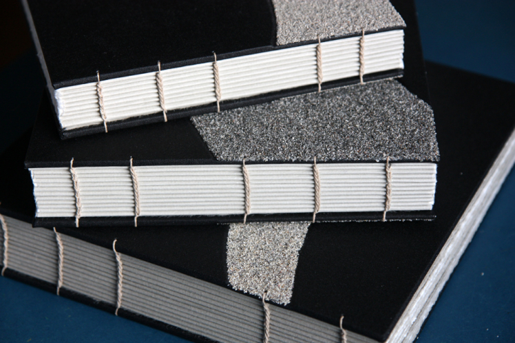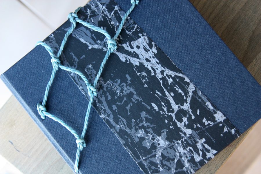 Over the years I have participated in a number of group exhibitions travelling to places such as Edinburgh, London and Germany. Playing with traditional book binding techniques and adapting them in response to the place I live in is a real joy. I incorporate new materials into traditional book structures such as sand, netting, fish farm overalls and creel hooks. In my decorative rock papers I play with rock patterns whilst the very process of making these papers with the melting of wax with ink and dyes echoes the melting of sediments in the formation of rocks defining the Uist shore line and visible in each tiny pebble on the beach – an unearthing of patterns and accidentals. In binding my books, I am able to understand my relationship with the spaces that surround me a little better and to communicate its nature with others through the medium of the book.